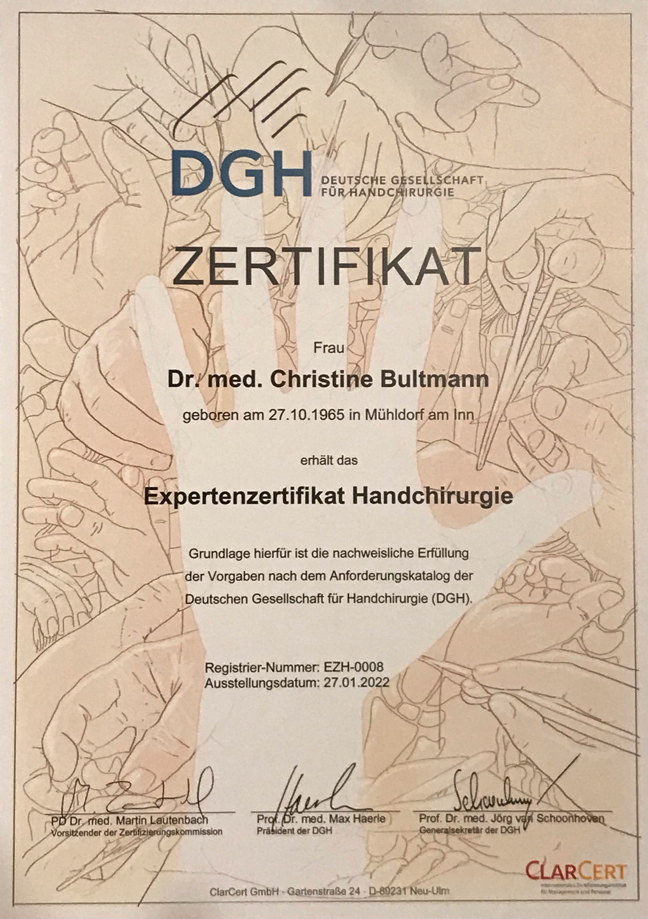 Im Januar 2022 wurde ihr das neu aufgelegte Expertenzertifikat Handchirurgie der DGH (Deutsche Gesellschaft für Handchirurgie) verliehen.