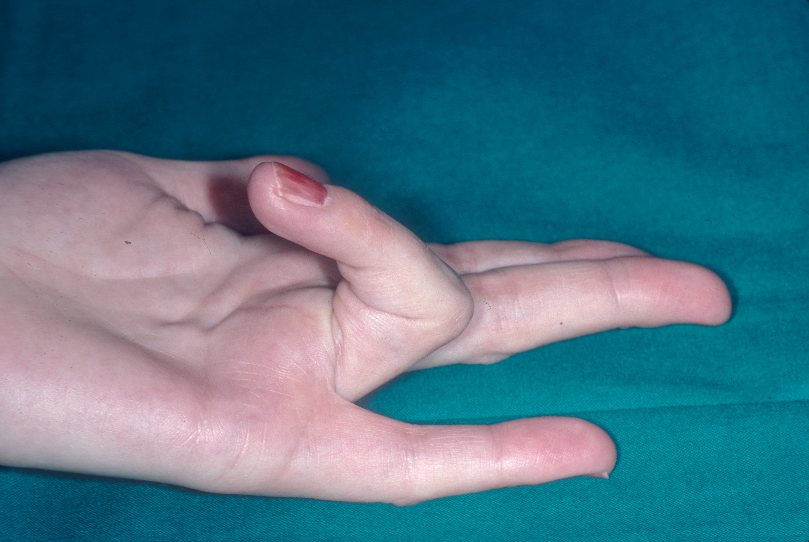 Die ersten Zeichen sind oft nur unspezifische Schmerzen und Schwellung der Fingergrundgelenke im Bereich der Handinnenfläche und des Handrückens. Manchmal besteht zusätzlich eine Morgensteifigkeit oder ein Spannungsgefühl. Erst im fortgeschrittenen Stadium kommt es zum typischen Schnappen mit bewegungsabhängigen Schmerzen. Im Extremfall kann es zu einer ständigen Blockierung des Fingers in Beugestellung kommen (siehe Bild). Ist der Daumen betroffen, wird das Schnappen häufig im Bereich des Daumenendgelenkes wahrgenommen.